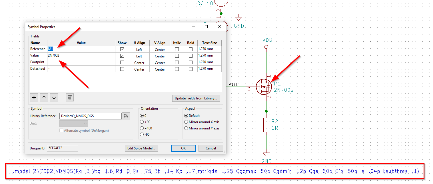 For discrete MOSFETs, the recommended approach is to use the VDMOS intrinsic model. This uses a standard 3-pin MOSFET symbol in the following order: