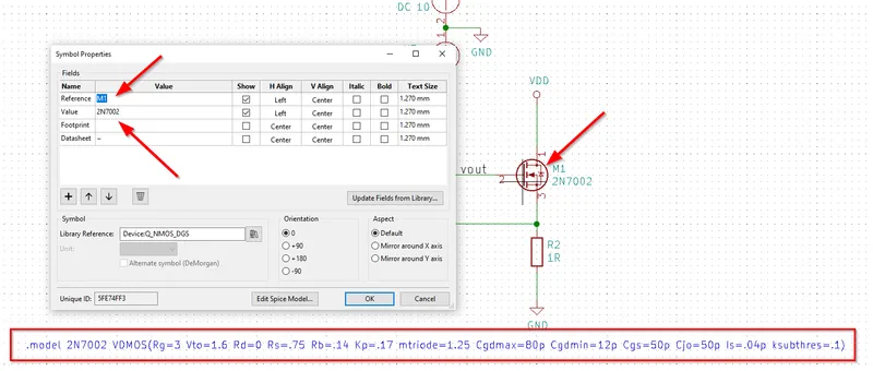 Fieldname: TypicallyValue, pointing to theValuesymbol property. Think of this as a symbol property pointer?Spice_Primitive: This determines the element type (ngspice nomenclature)Rfor resistors,Cfor capacitors,Dfor diodes,Xfor subcircuits (anything that is built out of many primitives, i.e. ICs), e.t.c. See the below table for a list of all the supported primitives.Spice_Model: Only needed whenSpice_Primitive = X.Spice_Lib_File: Filename (not full path) of SPICE library component that belongs to this symbol, e.g.ad8051.lib. ClickingEdit Spice Modelshould bring up a dialogue box with the text from the.libfile.- The path can be either relative or absolute. If relative, it can be relative to the same directory as the