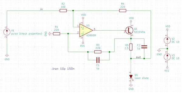 - laser_driver: Good example if you want to know how to include op-amps and transistors into your simulation. Notice that the pinout for the op-amp used in this schematic is very different to that of the op-amps in KiCAD’s two built-in simulation component libraries.