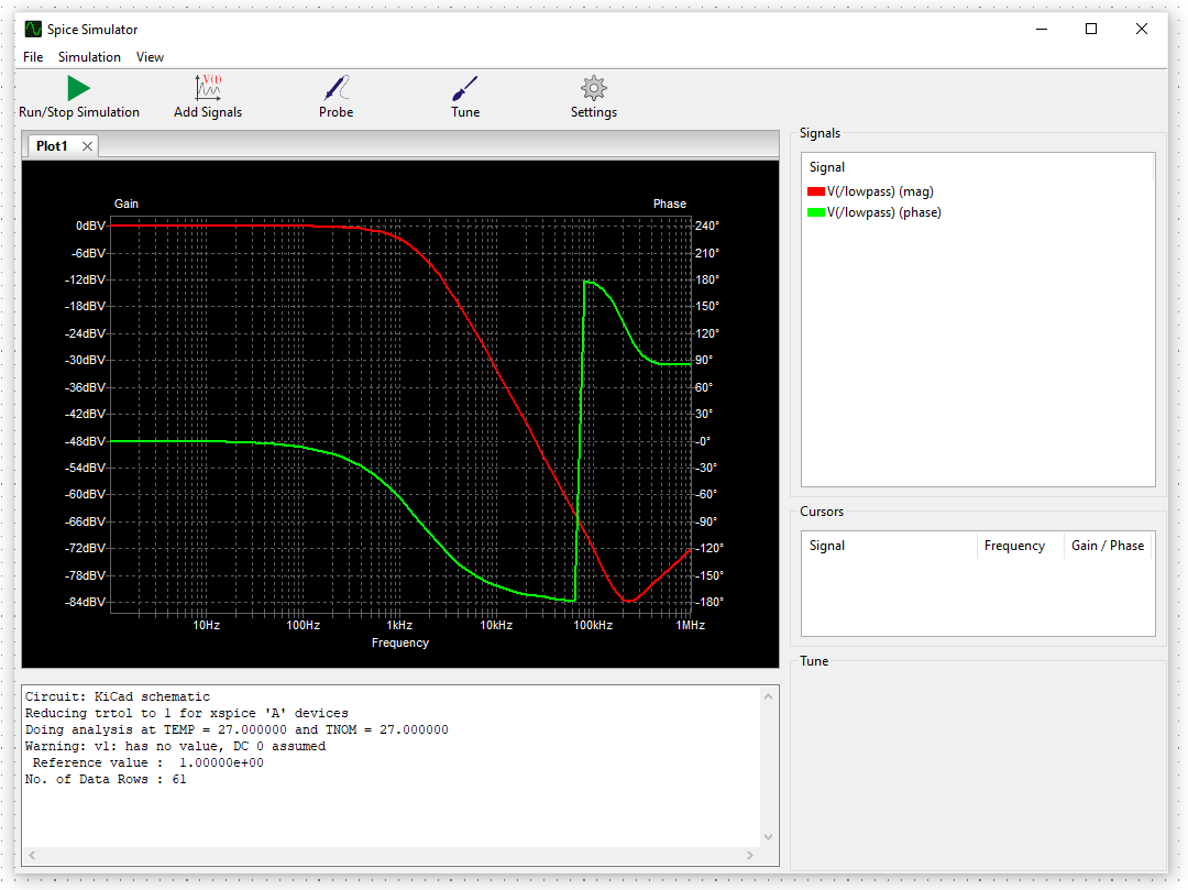 Note that is frequency is plotted on the x-axis, KiCad/ngspice will incorrectly export the data as Time in the csv file.
