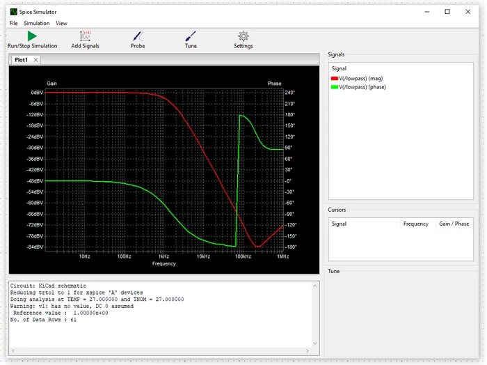 - AC analysis: The simulator outputs magnitude and phase information as a function of frequency. Good for analyzing passive and op-amp based analogue filters.