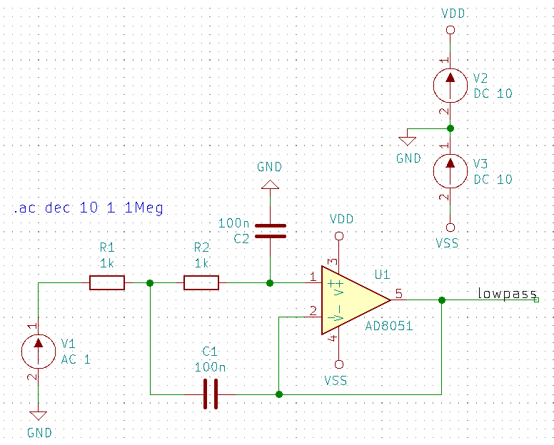 .ac dec 10 1 10MegIf you are going to run an AC analysis (i.e. using the .ac command), you don’t generally want more than one AC source in your schematic. If you have more than 1 AC source, the AC analysis results will be a superposition of all AC voltage sources and will be hard to interpret. To quote the ngspice manual: