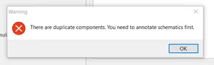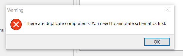 Error: unknown subckt: xd1 <net name> 0 1n5817Error: there aren't any circuits loaded.There are duplicate components. You need to annotate schematics first.