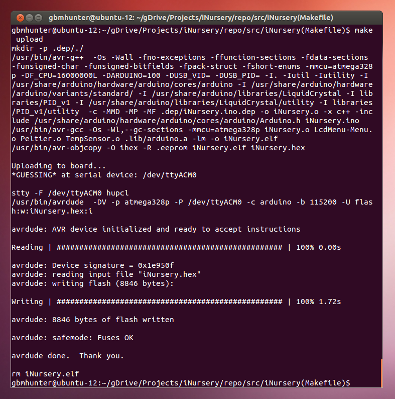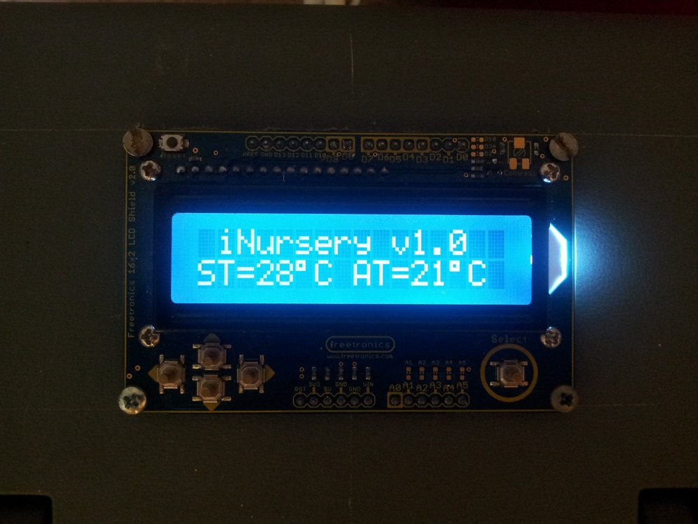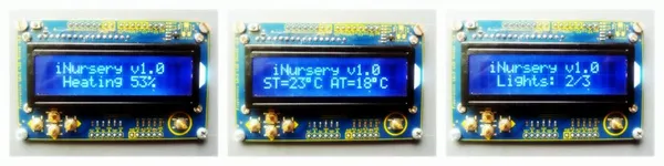 The LCD screen has three things it needs to display, the set and actual temperatures, the current drive state (e.g. heating or cooling, and the percentage of power), and how many lights were on. This was all too much for one 16x2 character LCD display a once, so there are three “screens” the LCD can display. The top row always says “iNursery v1.0” and the bottom row cycles between three states.