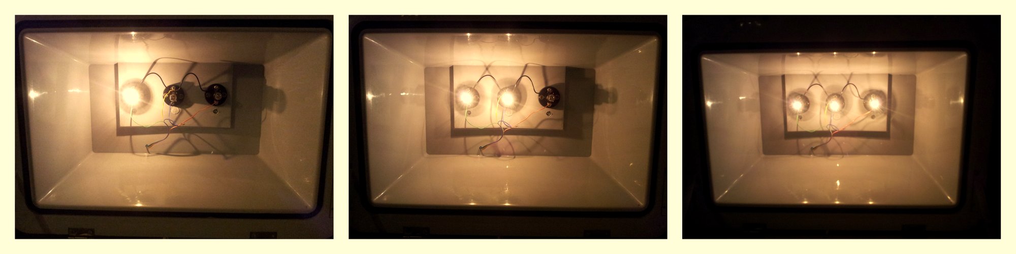 The lights couldn’t be driven directly from the Arduino (100mA is too much current), so I built a small daughter board for the Arduino with three N-channel MOSFETs on it to switch the light-bulbs on/off independently (for light level control).