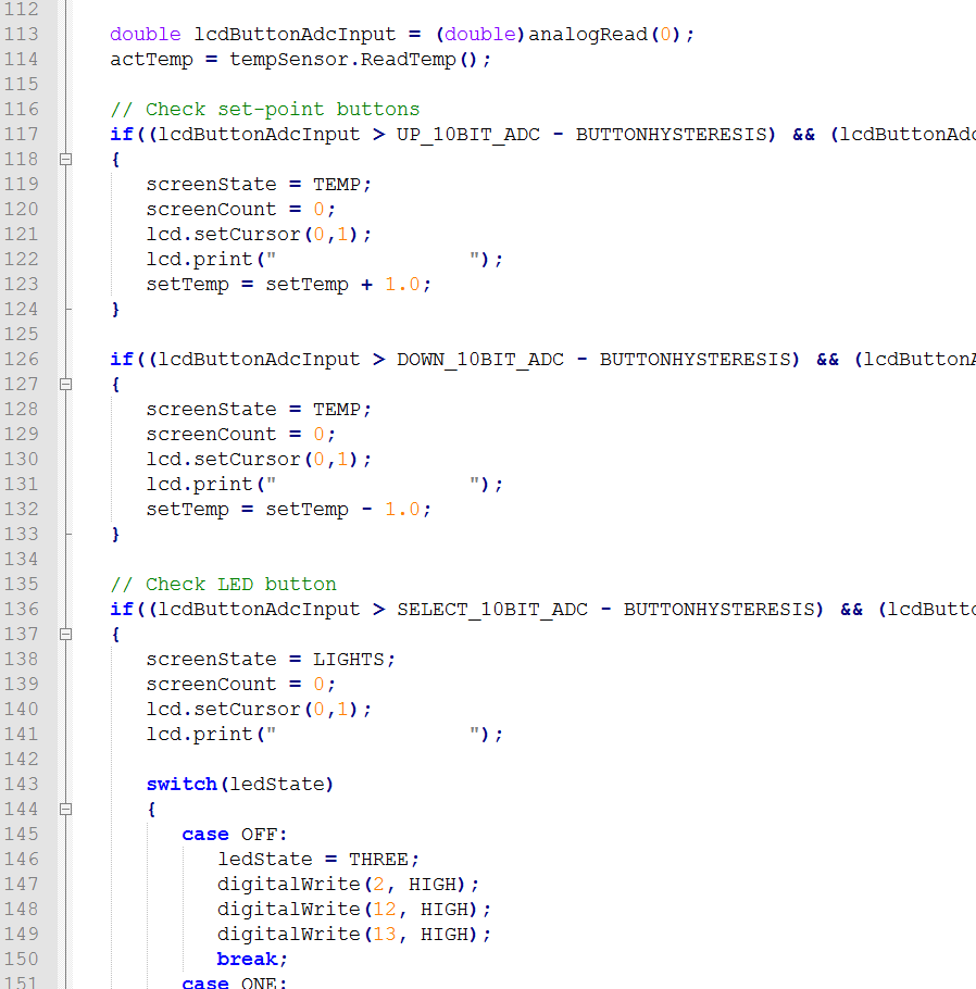 I used C++ and a mega-loop structure. I didn’t see a need for an RTOS, since the control is going to be relatively simple. The below image is part of the mega-loop.
