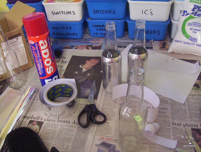 Leyden jars (aka High Voltage Capacitors, see the Wikipedia article) are an easy way to make high voltage capacitors, albeit with low capacitance. I wanted to make some for some high voltage experiments. I used clear beer bottles for the glass jars (which also serve as the dielectric), salt-water for the inside electrode, and aluminium tape wrapped around the bottle for the outside electrode. Stainless steel rod went through a cork in the top into the salt water to provide the electrical connection to the inner electrode.
