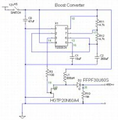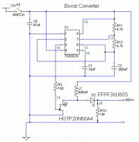 This was before I knew what a boost converter was, so I used the Aahz’s Boost Converter design (member of the www.4hv.org forum, see here). A blurry schematic (the only one I have!) of his design is shown below.