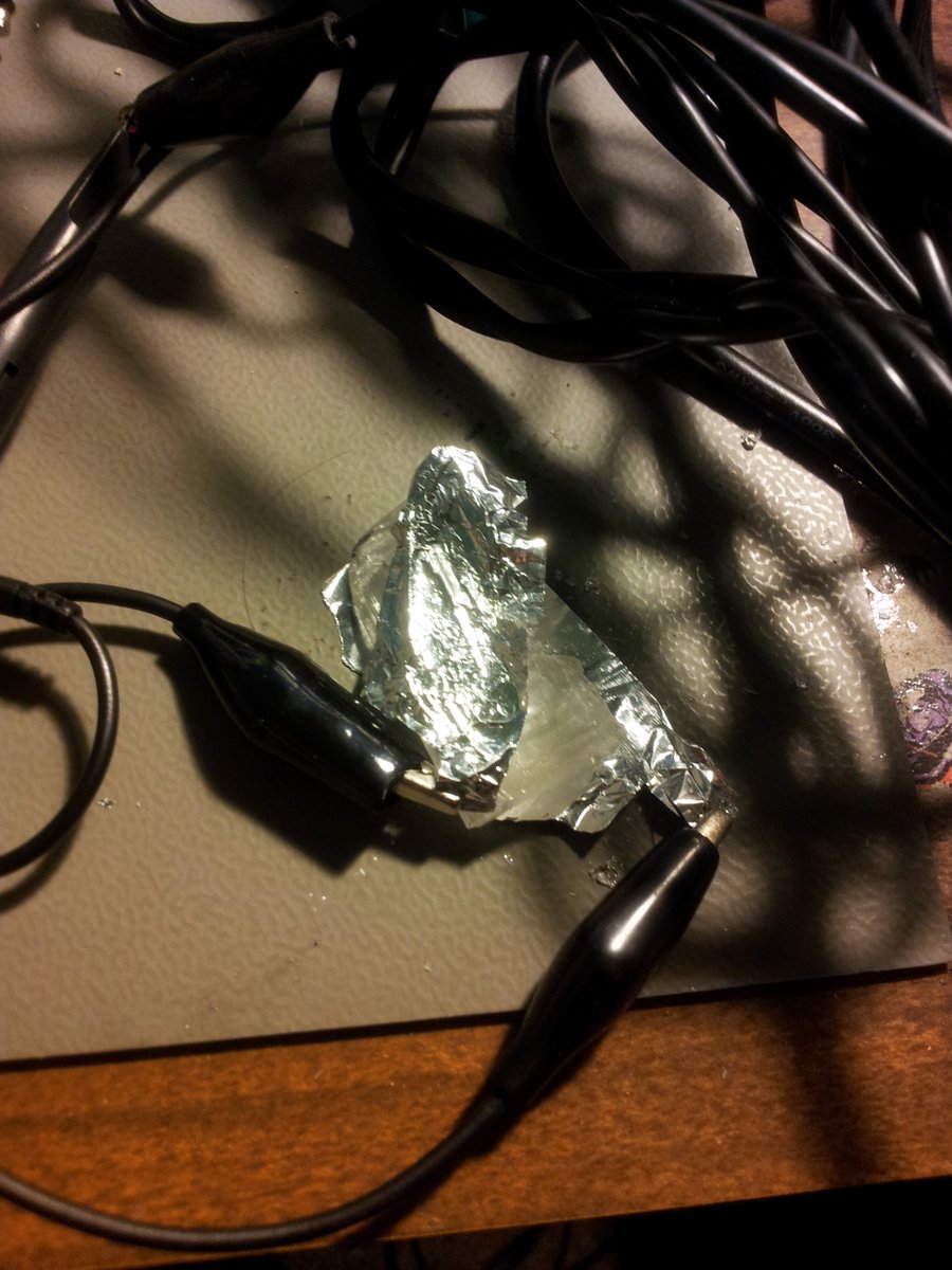 To do a crude test of whether or not it would produce a voltage when struck, the crystal was sandwiched between two pieces of tin foil that were connected to an oscilloscope.