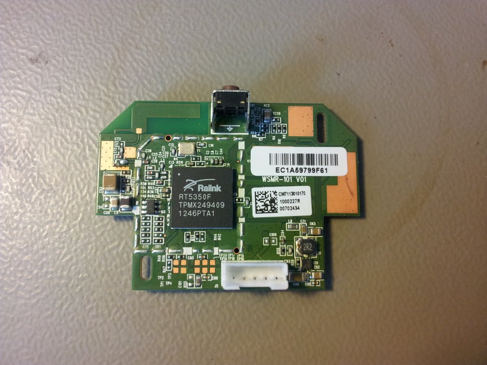 The main chip on this board is the Ralink RT5350F (other numbers on the IC are TPMX249409, 1246PTA1). This is a combined wireless front-end (1T1R 2.4G CMOS RF), stack (802.11n 1T1R MAC/BBP) and embedded CPU. I had a quick look on on AliExpress.com, and they seem to sell for about US$2.90, in quantities of 5 (Jan 2014). This is cheap (really cheap)! DigiKey nor any other non-Chinese supplier (try www.findchips.com) did not seem to stock these.