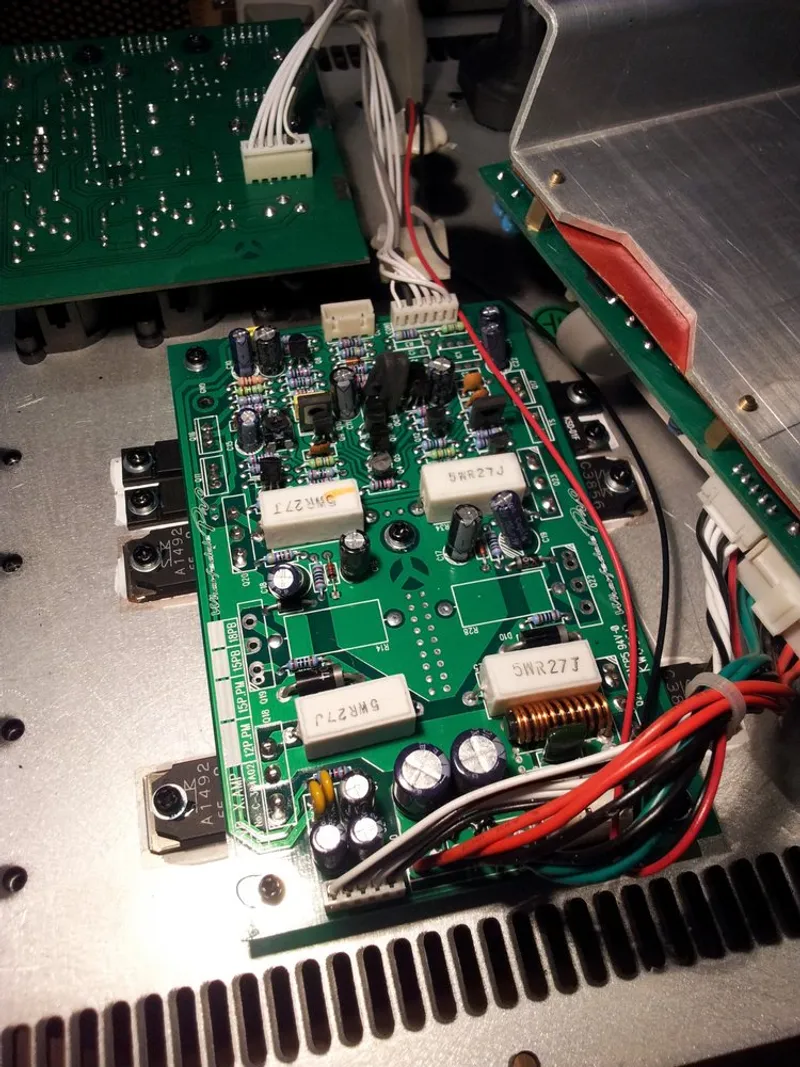 The four gruntiest looking power components are all in TO-3P packages and directly bolted onto the aluminium heatsink. Designators are Q18, Q20, Q21, Q23. Two are the Sanken 2SA1492 PNP transistors (product marking A1492 55 P), while the other two are Sanken 2SC3856 NPN transistors. They are complements to each other (mentioned in the respective datasheets).