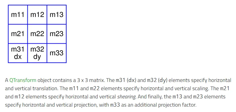 The structure of a Qt transformation matrix. Notice how the ordering is different to ‘standard’ (it looks like the matrix has been mirrored around the leading diagonal).
