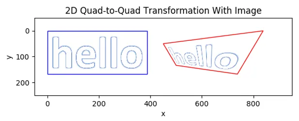 A quad-to-quad transformation of an image, going from a rectangle to a complex non-rectangular quadrilateral with no parallel edges.
