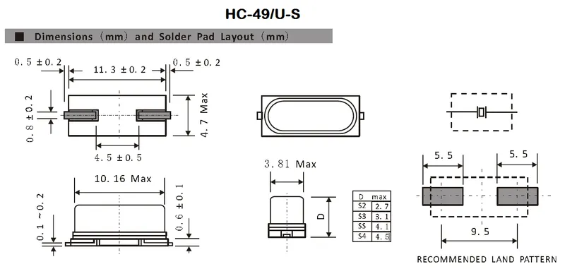 For info on un-named SMD crystal packages (which are more common than the HC-49/U-S due to their smaller size), see the SMD Crystal Packages page.