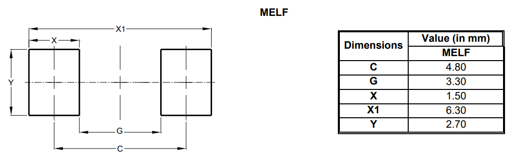 Below is the recommended land pattern for the MELF package from Diodes Inc: