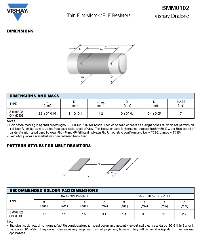 Vishay (2015, Dec 4). SMM0102 - Thin Film Micro-MELF Resistors [datasheet]. Retrieved 2024-04-16, from https://www.vishay.com/docs/20003/smm0102.pdf. ↩ ↩2