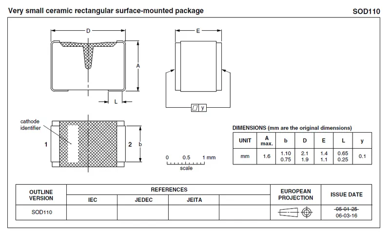 1. NXP (2016, Feb 8). SOD110 - very small ceramic rectangular surface-mounted package. Retrieved 2024-04-17, from https://www.nxp.com/docs/en/package-information/SOD110.pdf. 2 3