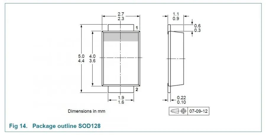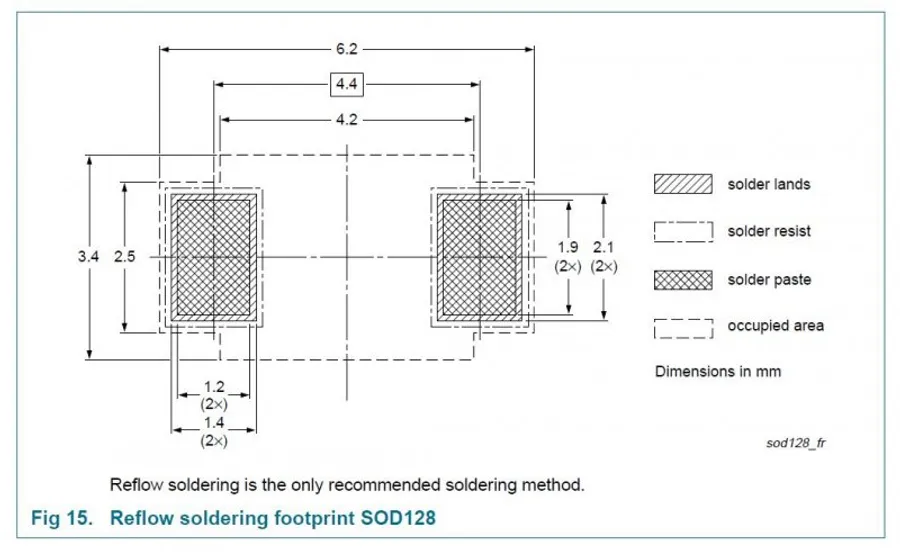 Nexperia. SOD128: plastic, surface mounted package; 2 terminals; 4 mm pitch; 3.8 mm x 2.6 mm x 1 mm body (package information). Retrieved 2022-03-28, from https://assets.nexperia.com/documents/package-information/SOD128.pdf. ↩ ↩2