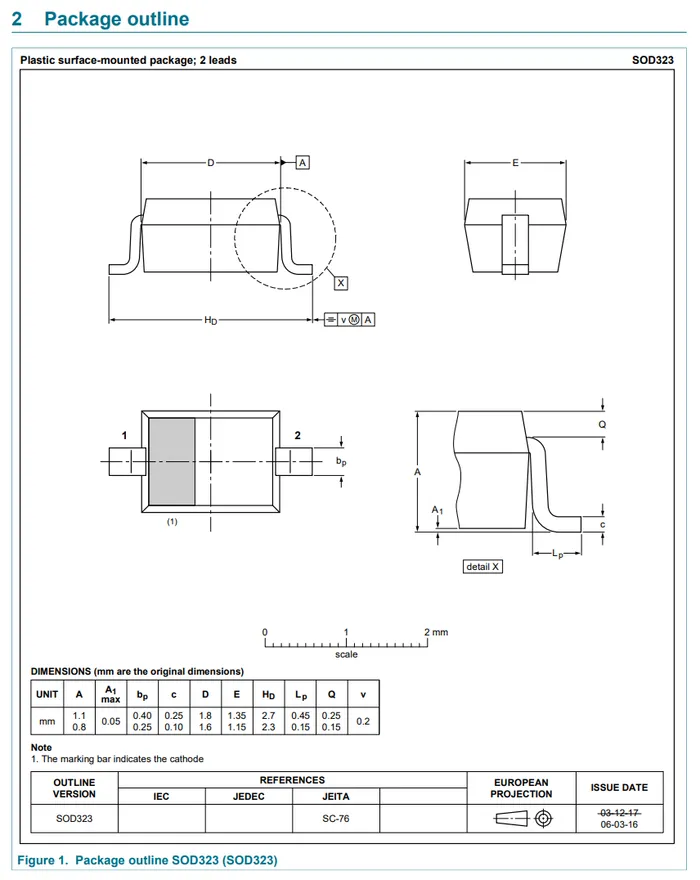 NXP (2019, July 30). SOD323 plastic, surface-mounted package; 2 leads; 1.3 mm pitch; 1.7mm x 1.25 mm x 0.95 mm body (datasheet). Retrieved 2022-03-25, from https://www.nxp.com/docs/en/package-information/SOD323.pdf. ↩ ↩2 ↩3 ↩4 ↩5