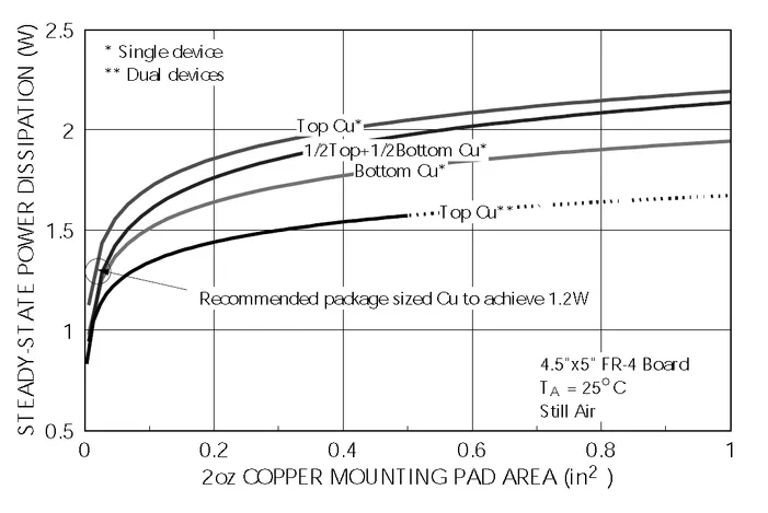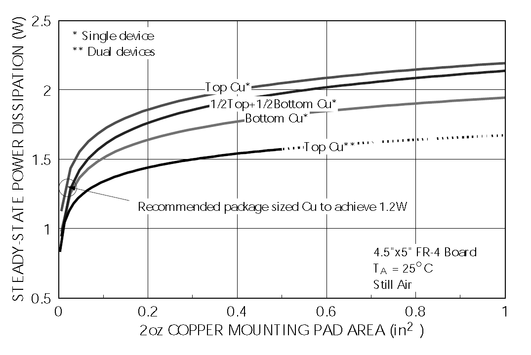 This graph shows the maximum power dissipation for the SOIC-8N component package, for various PCB copper areas.