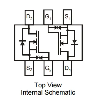 Some components using the SOT-363 package do not require any polarity marking as the pins are rotationally symmetric. This is a common configuration for a two-device MOSFET component, in where the pinout is shown below: