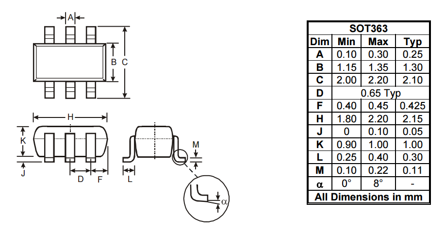 NXP (2018, May 9). SOT363 - plastic, surface-mounted package; 6 leads; 0.65 mm pitch; 2mm x 1.25 mm x 0.95 mm body. Retrieved 2024-04-19, from https://www.nxp.com/docs/en/package-information/SOT363.pdf. ↩ ↩2 ↩3