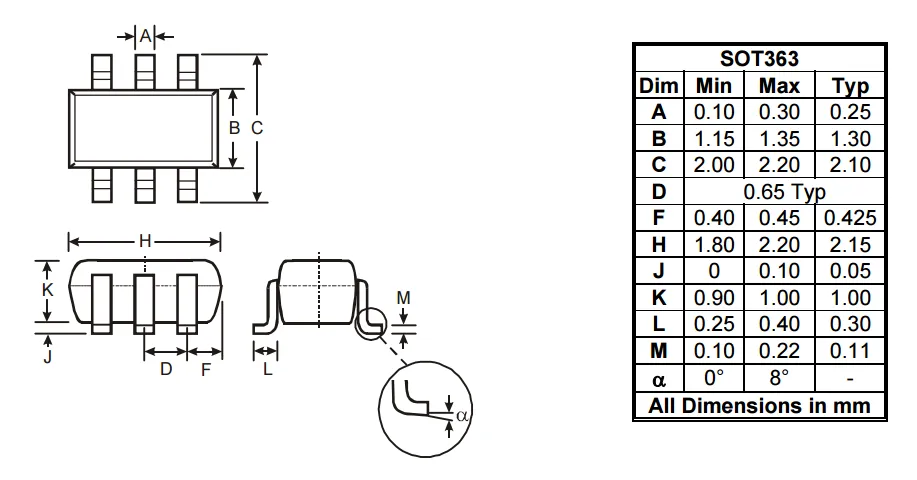 | SOT-363 | 1.25mm | 2.0mm | 2.1 | 0.65mm | 6 |