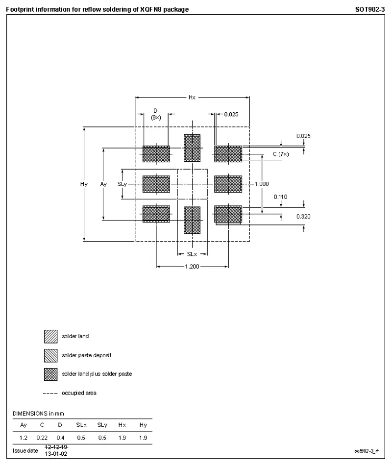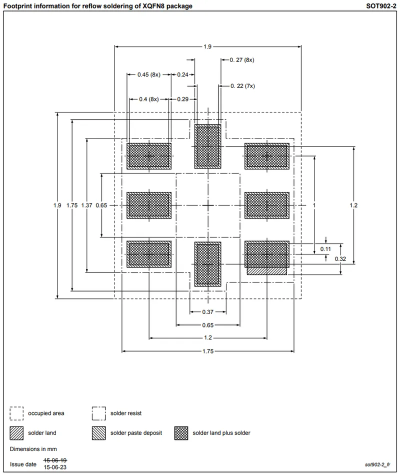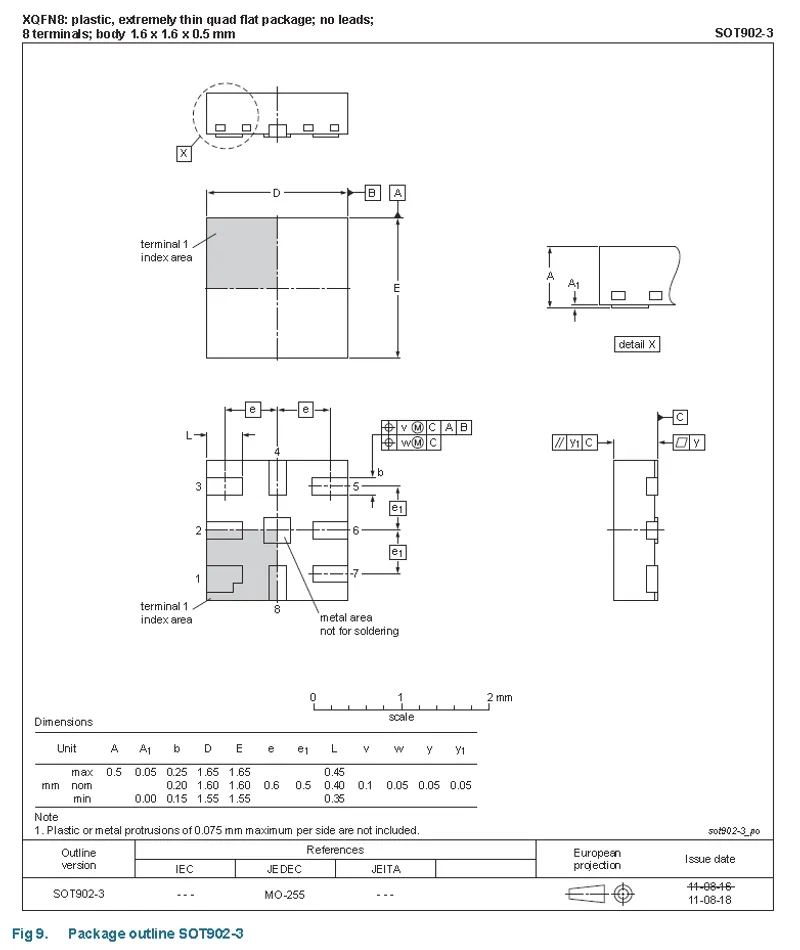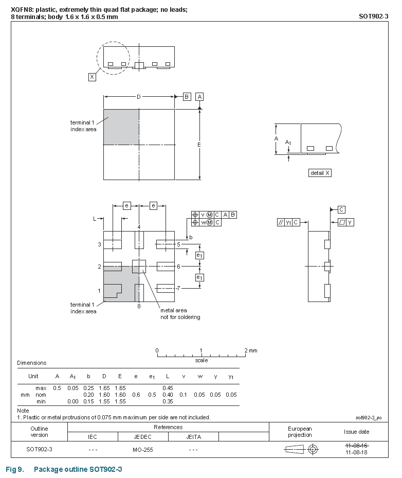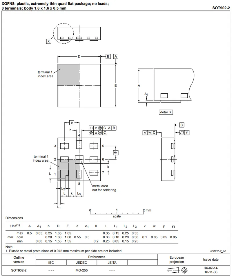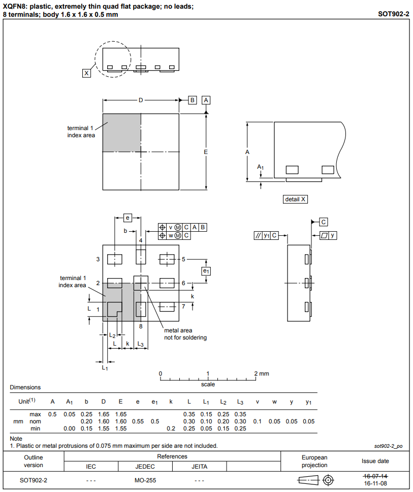 NXP (2016, Feb 8). SOT902-1 - plastic extremely thin quad flat package; no leads; 8terminals; UTLP based; body 1.6 x 1.6 x 0.5 mm. Retrieved 2024-04-20, from https://www.nxp.com/docs/en/package-information/SOT902-1.pdf. ↩