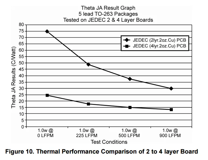 The junction-to-ambient thermal resistance for the TO-263-3 component package on both standard JEDEC 2-layer and 4-layer boards is shown below: