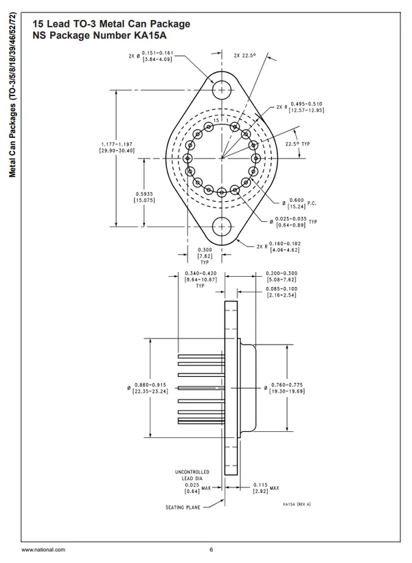 A variant of the TO-3 package with a exceptionally large number of leads, 15. National Semiconductor’s package code for this variant is KA15A1.