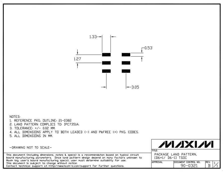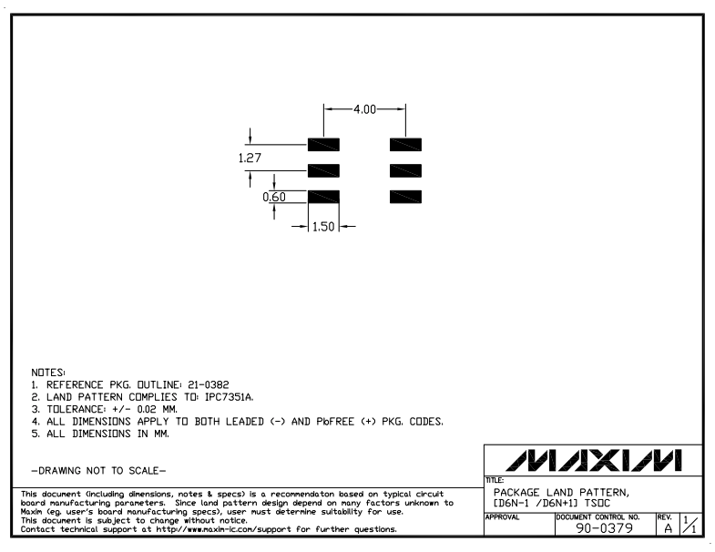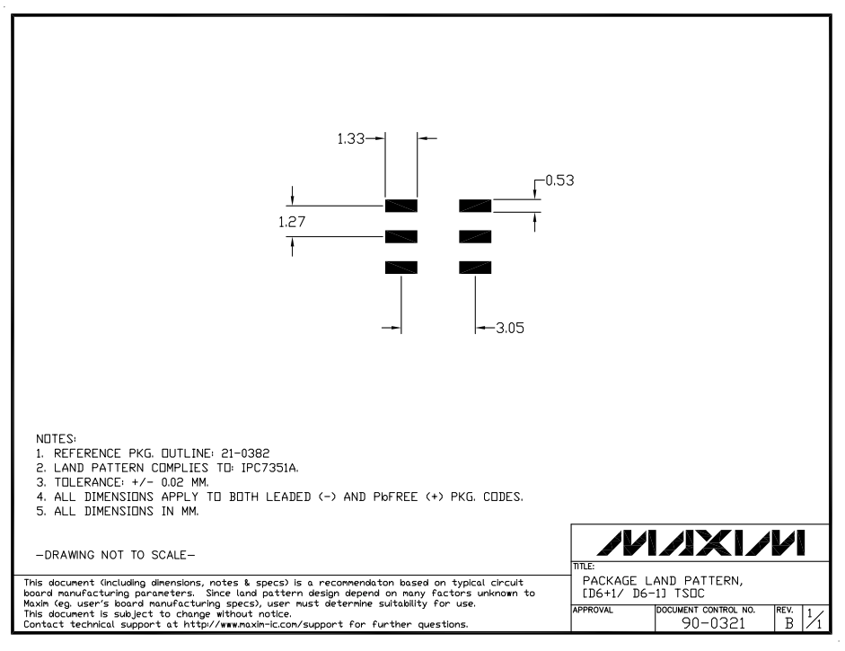 See https://www.maximintegrated.com/en/design/packaging/package-information.html for the official dimensions and land patterns from Maxim Integrated.