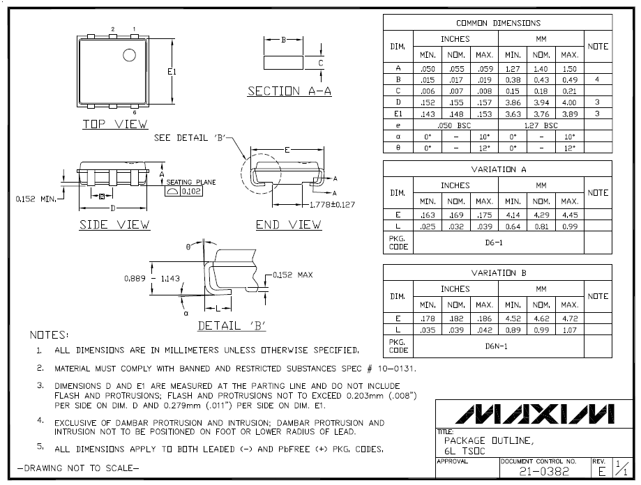 As far as I can tell, this package only comes in the 6-pin version (TSOC-6), and is only used by Dallas/Maxim (since 2001, Dallas has been a subsidiary of Maxim). While Maxim Integrated lists four different variants (see the Title section of the recommended land patterns below), there seems to be no physical difference between the D6+1 and D6-1 variants, and no difference between the D6N+1 and D6N-1 variants. The difference between the variants with and without N in their name are the package width and the lead length (and hence two slightly different land patterns).