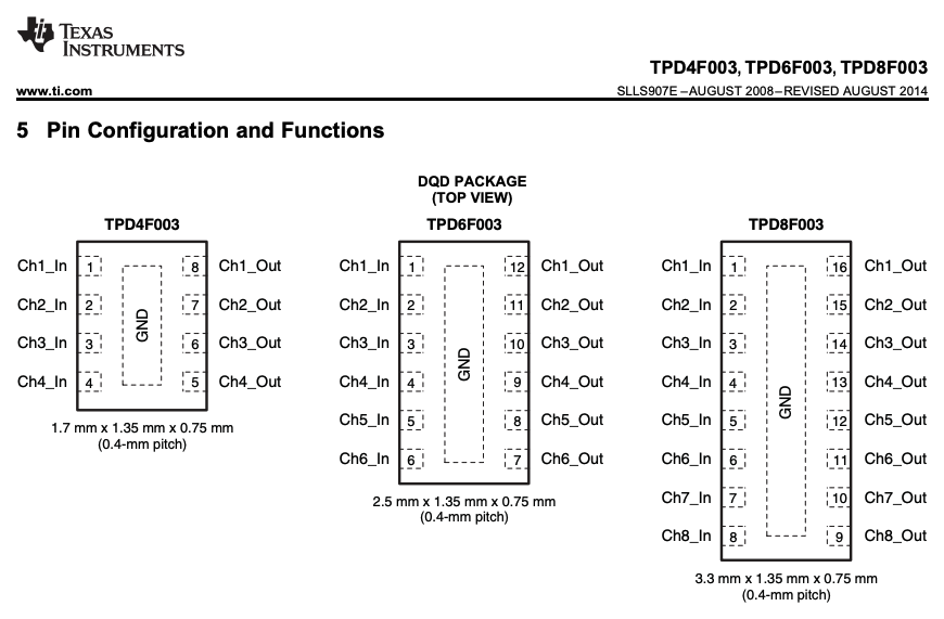 Texas Instruments (2014, Aug). TPDxF003: Four-, Six-, and Eight-Channel EMI Filters With Integrated ESD Protection (datasheet). Retrieved 2022-04-05, from https://www.ti.com/lit/ds/symlink/tpd8f003.pdf. ↩ ↩2 ↩3