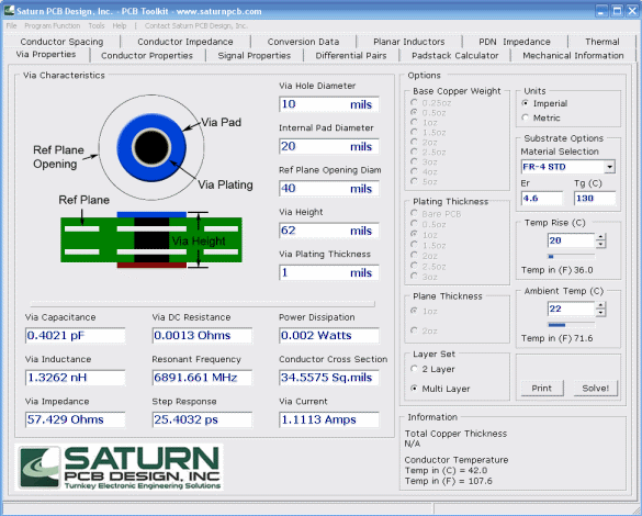 Very simple but extensive PCB design aid. And it’s free! Includes a via current calculator, trace width calculator, bandwidth calculator, differential pair calculator, mechanical data, conductor impedance calculator, unit conversions, planar inductor calculator, thermal resistance calculator and more!