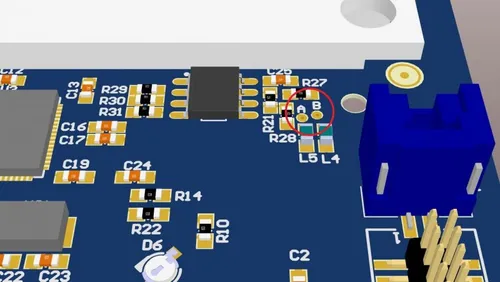 A common and easy way to add test points onto a PCB is to leave some vias untented. This means that they don’t get covered in solder mask, and you can easily probe them. Their circular nature holds the probe well to! The picture below shows two untented-vias, A and B, being used a test points.
