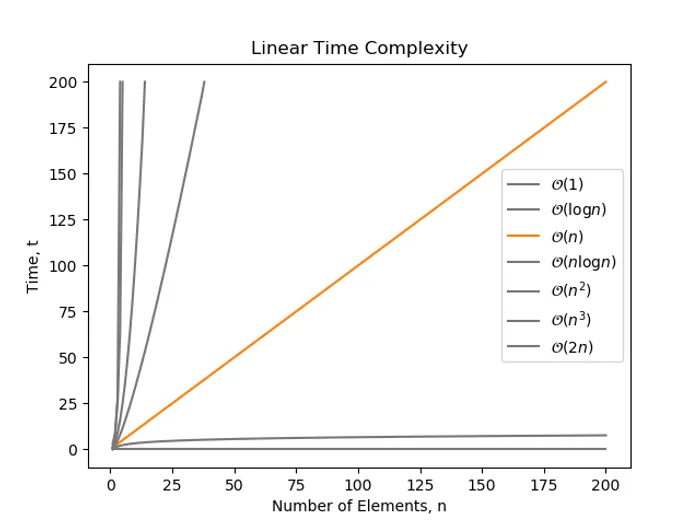Linear time is when an algorithm grows at a rate proportional to the number of elements, . A simple for loop has complexity: