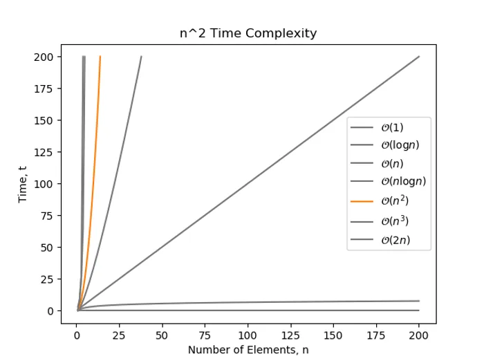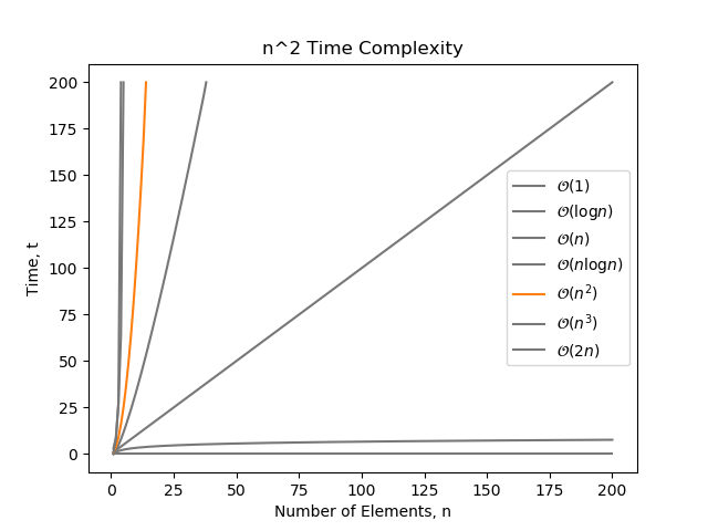 complexity is proportional to the square of the number of elements . This is a bad form of complexity to have, especially when grows large.