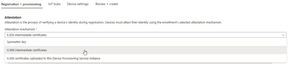 - Symmetric key authentication: The IoT device has a pre-created symmetric key which IoT also knows about. The device presents a signature based on the symmetric key as proof of identity.