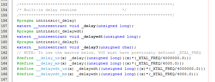 Delays are provided by the compiler/library through the __delay_us() and __delay_ms() functions.