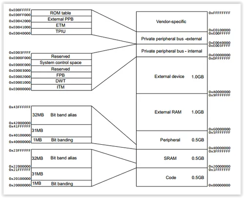 The Cortex-M3 has two 32MB regions that map onto the two 1MB bit-band regions. The two regions are separate, one in the SRAM region and one in the peripheral region (but both of course in the same memory space). The diagram below shows the entire Cortex-M3 memory space, with the bit band locations being close to the bottom of memory.