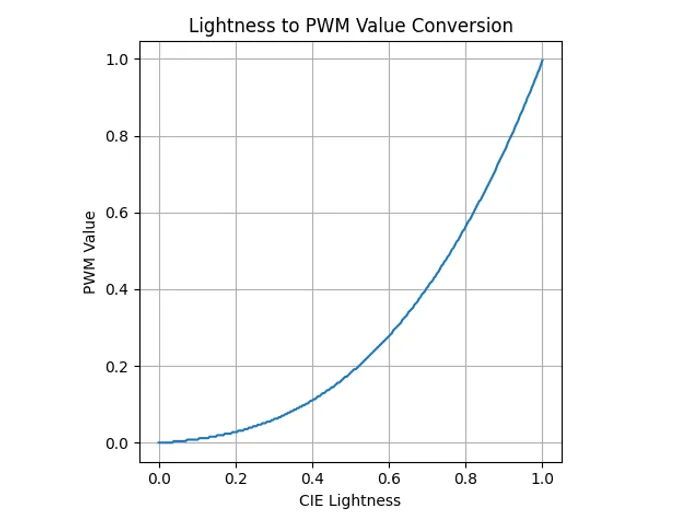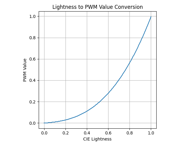 const uint16_t CIE_LIGHTNESS_TO_PWM_LUT_256_IN_10BIT_OUT[] = { 0, 0, 0, 1, 1, 2, 2, 3, 3, 4, 4, 4, 5, 5, 6, 6, 7, 7, 8, 8, 8, 9, 9, 10, 10, 11, 11, 12, 12, 13, 14, 14, 15, 15, 16, 17, 17, 18, 19, 20, 20, 21, 22, 23, 24, 24, 25, 26, 27, 28, 29, 30, 31, 32, 33, 34, 35, 36, 38, 39, 40, 41, 42, 44, 45, 46, 48, 49, 50, 52, 53, 55, 56, 58, 59, 61, 62, 64, 66, 67, 69, 71, 73, 74, 76, 78, 80, 82, 84, 86, 88, 90, 92, 94, 96, 98, 101, 103, 105, 107, 110, 112, 115, 117, 120, 122, 125, 127, 130, 132, 135, 138, 141, 143, 146, 149, 152, 155, 158, 161, 164, 167, 170, 173, 176, 180, 183, 186, 190, 193, 196, 200, 203, 207, 211, 214, 218, 222, 225, 229, 233, 237, 241, 245, 249, 253, 257, 261, 266, 270, 274, 278, 283, 287, 292, 296, 301, 305, 310, 315, 320, 324, 329, 334, 339, 344, 349, 354, 359, 365, 370, 375, 380, 386, 391, 397, 402, 408, 414, 419, 425, 431, 437, 443, 449, 455, 461, 467, 473, 479, 485, 492, 498, 505, 511, 518, 524, 531, 538, 545, 551, 558, 565, 572, 579, 586, 594, 601, 608, 616, 623, 631, 638, 646, 653, 661, 669, 677, 685, 693, 701, 709, 717, 725, 733, 742, 750, 759, 767, 776, 784, 793, 802, 811, 820, 829, 838, 847, 856, 865, 875, 884, 893, 903, 913, 922, 932, 942, 952, 962, 971, 982, 992, 1002, 1012, 1023,};See how there is far less identical outputs at the start of the LUT when using a 10-bit output? Only the first three lightness values map to a 12-bit PWM of 0, rather than the first 10 when using a 8-bit PWM.