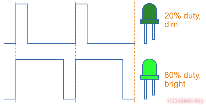 So we can very the duty cycle of the PWM to vary the light output (radiant flux) of the LED. 0% duty cycle would make the LED turn off, and 100% duty cycle would be full brightness. The video below shows an LED being faded from 0% intensity to 100% intensity in this manner: