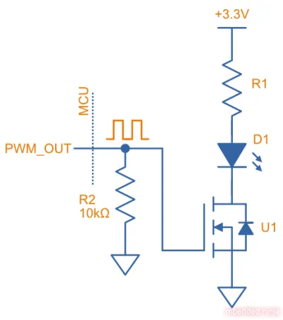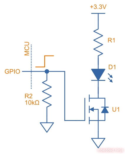 The below image shows how you can do this. The MOSFET U1 has been added so that the LED can be driven with currents higher than the maximum specified by the microcontroller’s GPIO pin (which is normally in the 1-20mA range, check the datasheet of the MCU!). You could omit this MOSFET (and the resistor R2) and just drive the LED directly if the MCU can supply the required current directly.