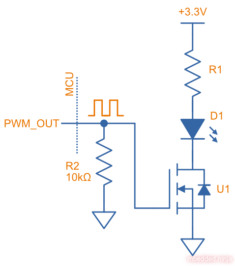 This page how to control the brightness of a single LED using PWM with firmware running on a microcontroller. We’ll assume you want to vary the brightness, and to do so in a smooth manner. We’ll start of by covering the basics with linear duty-cycle control and then move onto more advanced ways that take into account the human eye’s non-linear response to light intensity.