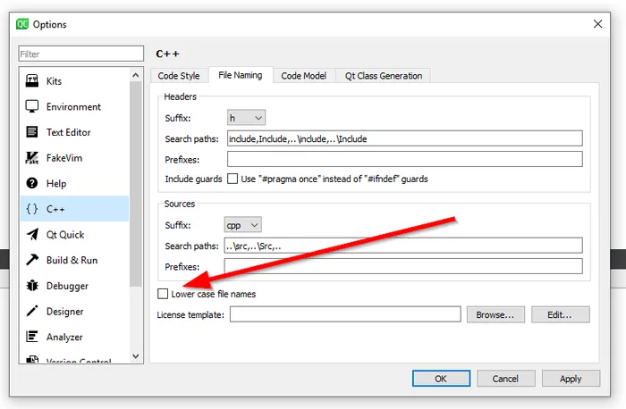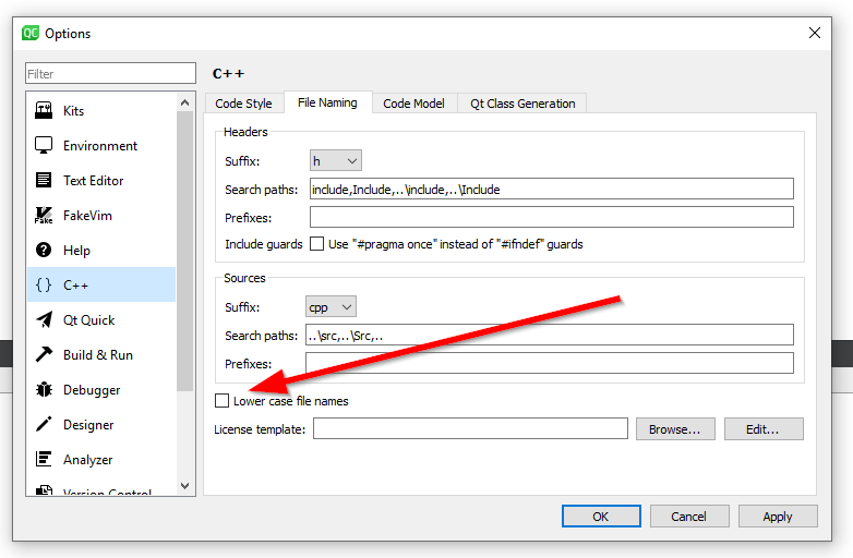 It seems a little strange, that by default, Qt Creator will not allow files with capital letters in them. This was probably done to prevent problems when using FAT32 file systems (e.g. older versions of Windows) that were case insensitive (yet case preserving). However, many common file naming standards for C++ along with many 3rd party libraries will use capital letters. Luckily, you can enable/allow capital letters in file names in the Qt Creator settings: