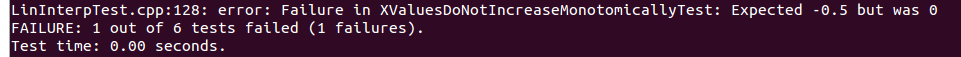 Example output from UnitTest++ when one of the tests fails.