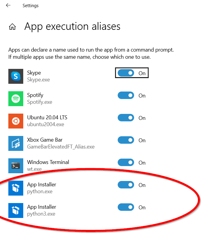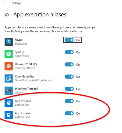 Windows 10 introduced what I consider a really annoying “feature” called App Execution Aliases. What this means is that if you don’t have python installed on your system but try and execute python.exe, Windows will jump in a load up the Windows Store to prompt you to download and install it. While good natured in principle, it causes many headaches as 3rd party software which tried to invoke python will not get the error message it expects.