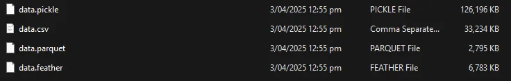 For large datasets, CSV files might become too large and slow to save and load. Pandas also supports a number of other file formats/serialization protocols, including pickle (Python’s built-in serialization protocol), Feather and Parquet.