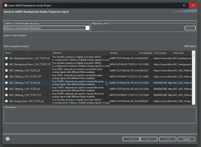 Code examples can be found within AURIX Development Studio by clicking “Import Project”. This will load up the “Infineon Code Examples Repository” and display a large number of example projects to get started with.