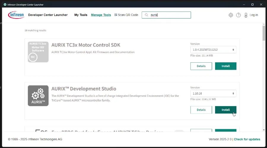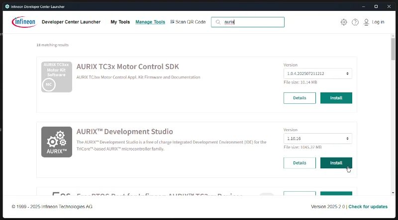 One of the easiest ways to install AURIX Development Studio is to use the Infineon Developer Center Launcher. Download and install the launcher, navigate to “Manage Tools”, find the “AURIX Development Studio” entry and click on “Install” (you have to be logged in to download this).